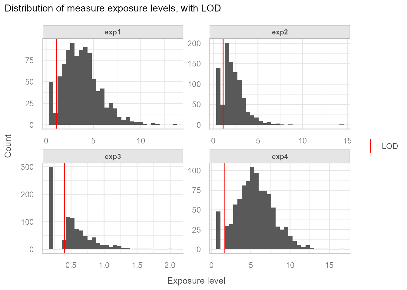 exp1,exp2,exp3andexp4, left censored (LOD), with missing data. Data below LOD is reported as “<LOD”. -